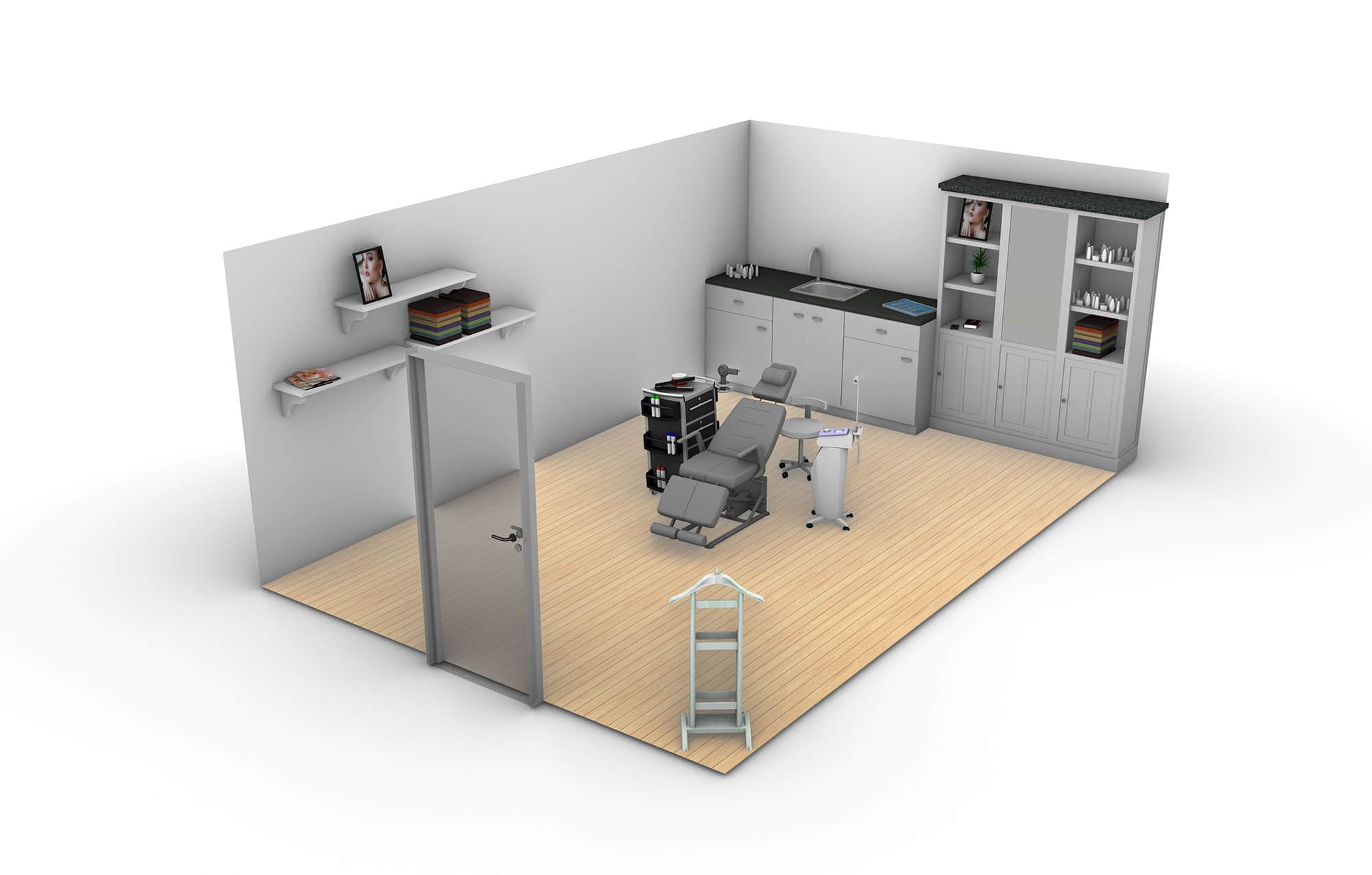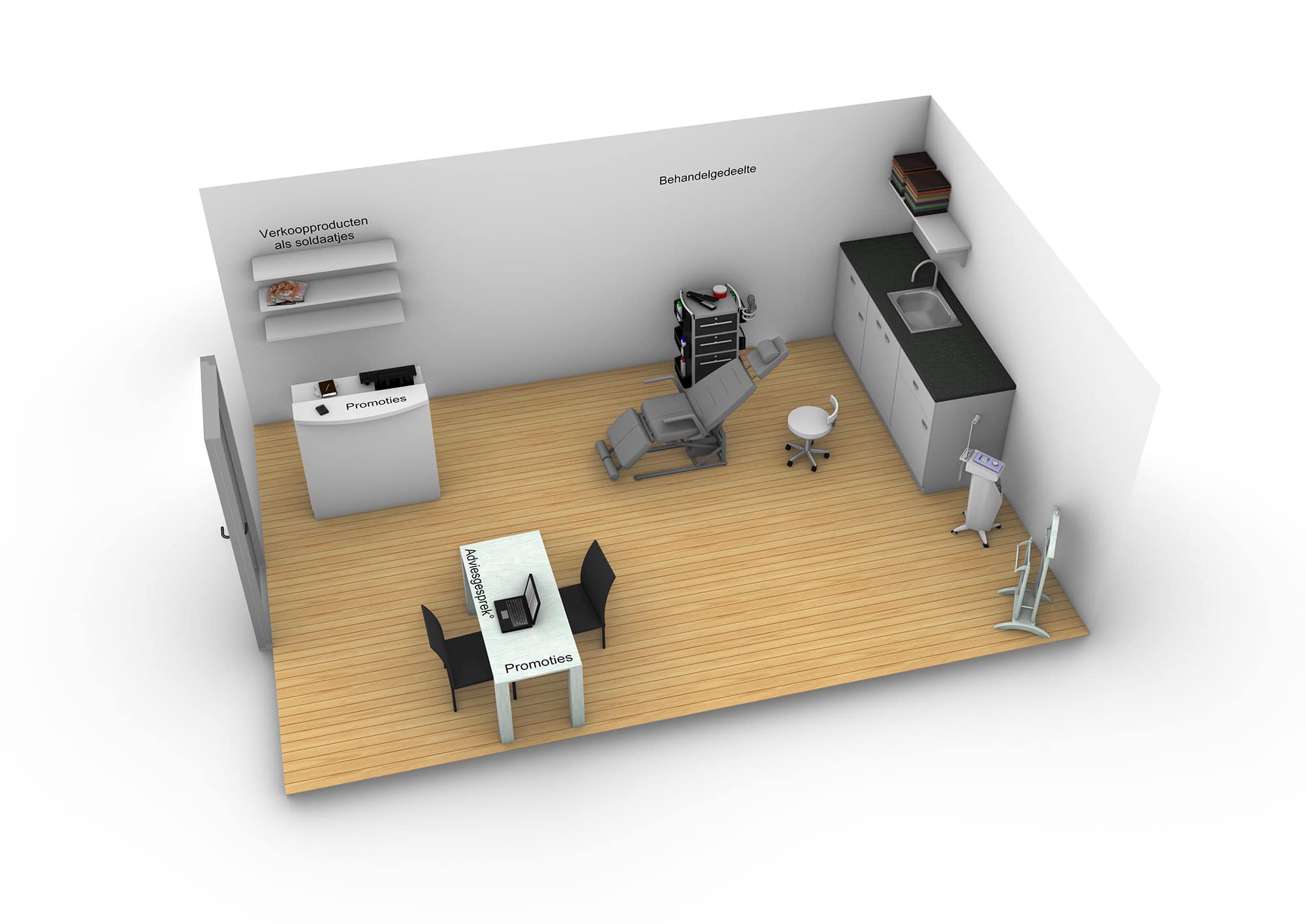 Hieronder zie je een voorbeeld van een salon met de klassieke opstelling, waar alles erop gericht is om behandelingen te geven.