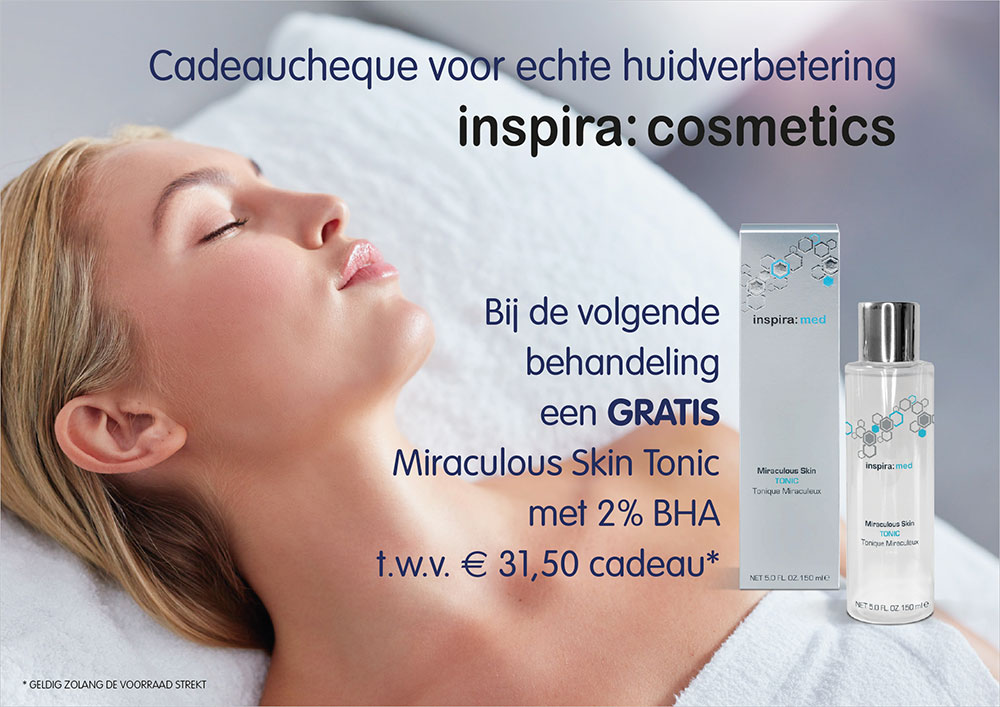 Het cadeau dat wij onze klanten ter beschikking stellen om de consument cadeau te geven, is de Miraculous Skin Tonic met 2% BHA. Deze Tonic sluit perfect aan op onze behandelingen en zorgt ervoor dat de huidverbetering een steeds hoger niveau bereikt. De consument ziet dat en komt enthousiast terug.